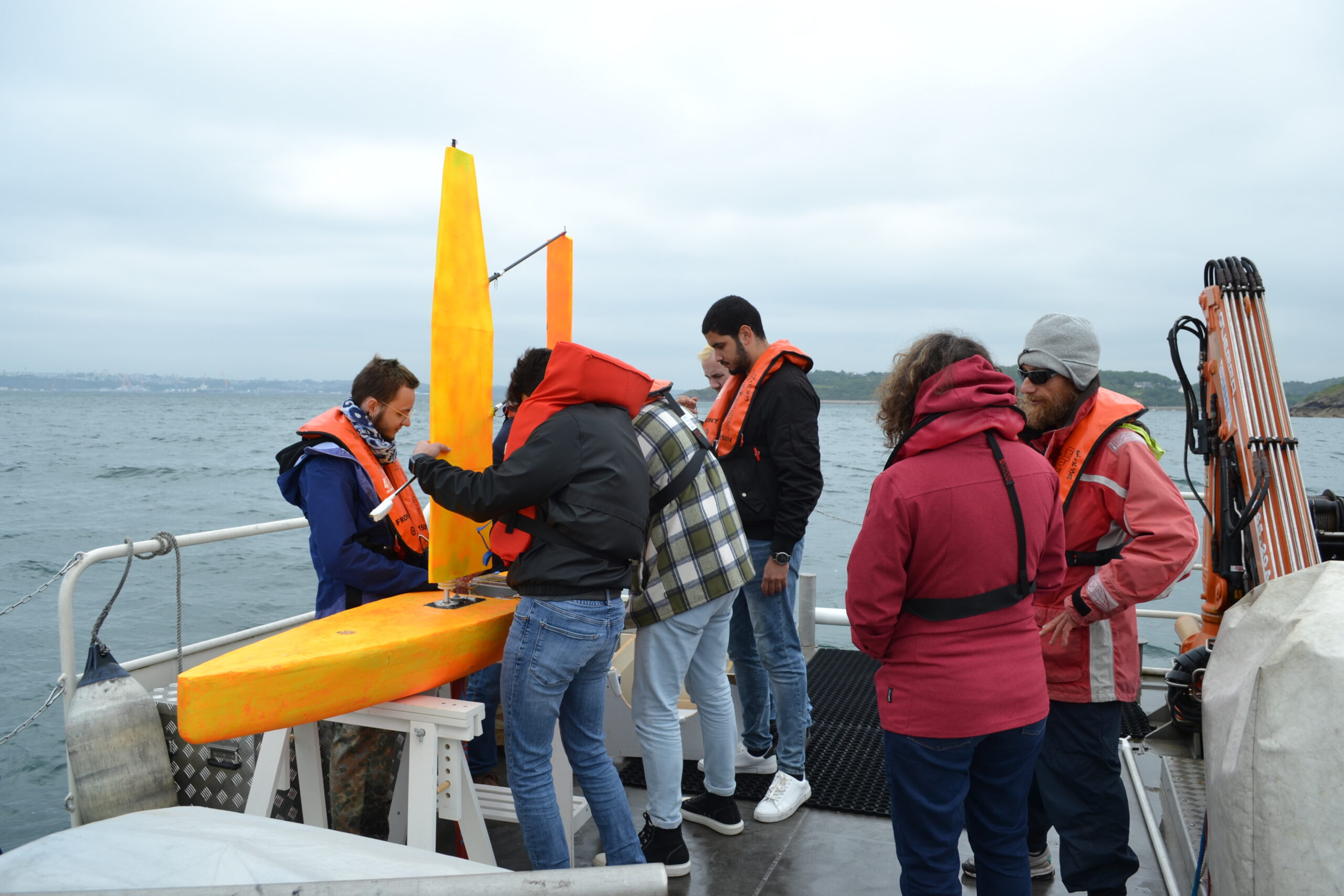 Suite à deux demi-journées de formation en salle sur la planification et la réalisation d’expérimentations en mer dispensées par CELADON, un groupe d’étudiants en 5ème année de l’école d’ingénieur ENIB est venu à bord de notre navire pour une journée d’essai, le 31 mai. L’objectif était d’effectuer des tests de validation de leur voilier autonome biosourcé Lincroyap.